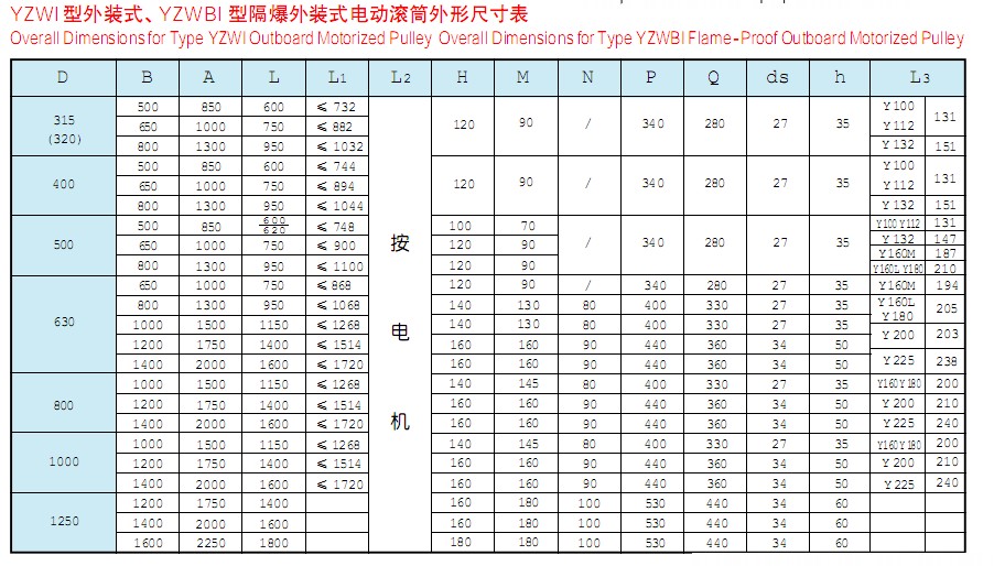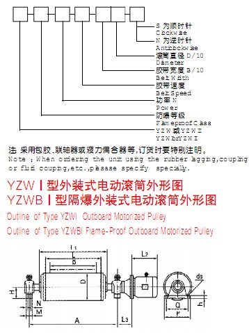 該產(chǎn)品是供各種固定式帶式輸送機(jī)、斗式提升機(jī)、卷揚(yáng)機(jī)等配套的新型驅(qū)動(dòng)裝置。其內(nèi)部采用行星擺線減速機(jī)構(gòu),使電機(jī)外露與滾筒直聯(lián),具有承載能力大、過載能力強(qiáng)、傳動(dòng)平穩(wěn)、噪音低、壽命長,使用維修方便,操作安全可靠等優(yōu)點(diǎn)??蓾M足各種逆止、包膠等要求。隔爆外裝式電動(dòng)滾筒其隔爆標(biāo)志位dl、dllAT4。dl適合于有甲烷或煤塵礦井中,dllAT4適合于有I、IIA級(jí)T2~T4組爆炸危險(xiǎn)性混合物存在的場所,dllBT4適用于有I、IIA、IIB級(jí)T2~T4組爆炸危險(xiǎn)性混合物存在的場所。