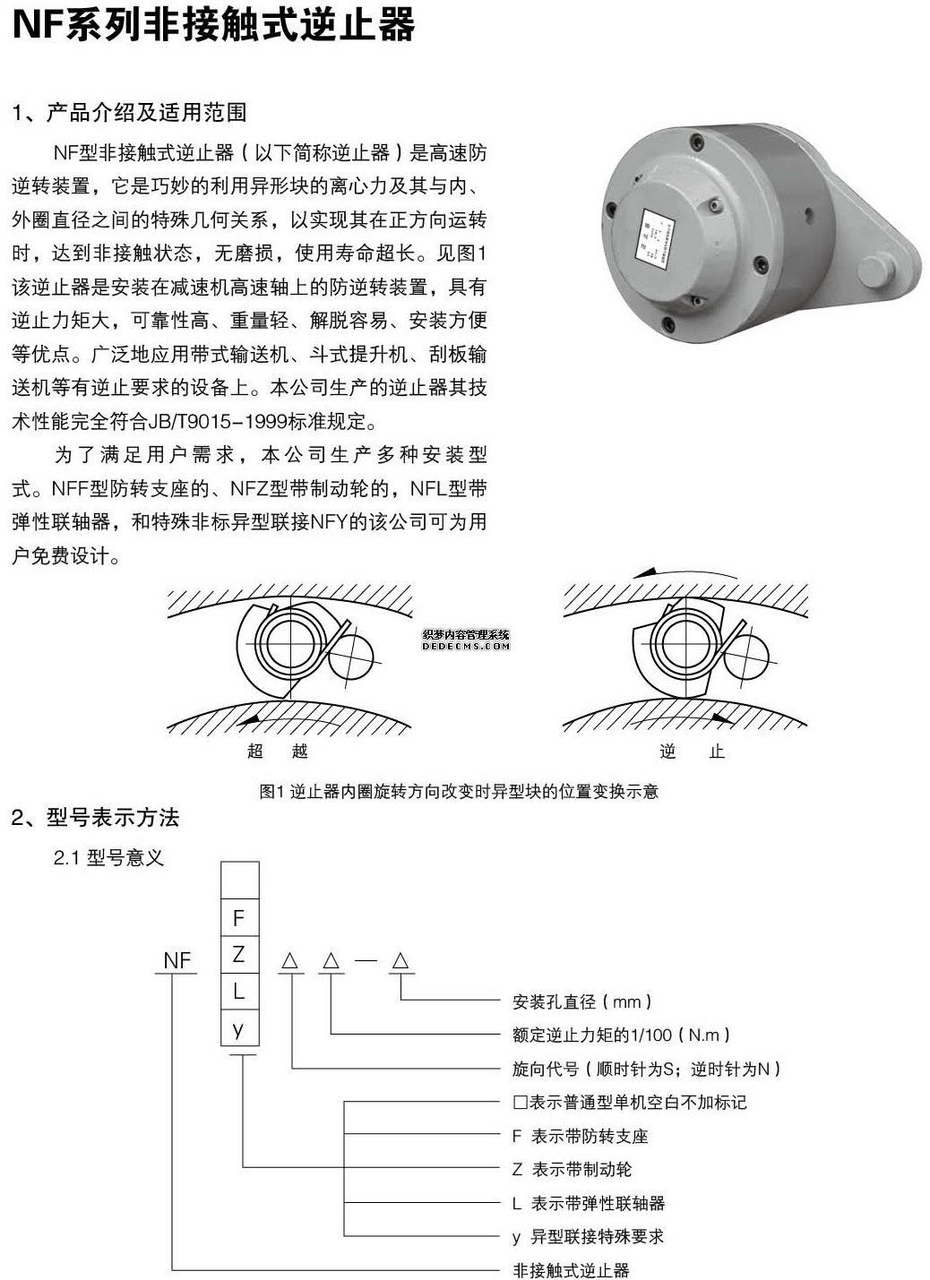 NF型非接觸式逆止器(以下簡(jiǎn)稱逆止器)是高速防逆轉(zhuǎn)裝置,它是巧妙的利用異形塊的離心力及其與內(nèi)、外圈直徑之間的特殊幾何關(guān)系,以實(shí)現(xiàn)其在正方向運(yùn)轉(zhuǎn)時(shí),達(dá)到非接觸狀態(tài),無(wú)磨損,使用壽命超長(zhǎng)。