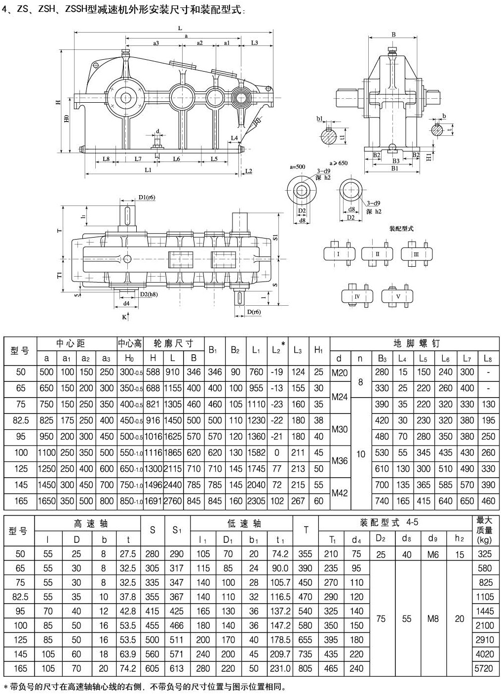 ZS,ZSH型減速機主要用于超重,礦山,通用化工,紡織,輕工等行業(yè),其適用條件如下:減速機齒輪傳動圓周速度不大于4米/秒;高速軸的轉速不大于1500轉/分;用于正反兩向運轉;工作溫度為-40度至40度。九種傳動比,九種配置形式和三種低速軸端型式。 型號標記示例:ZS(ZSH) - 500-5- II ZS(ZSH)是減速機型號,500是總中心距,5是傳動比代號,II裝配形式。