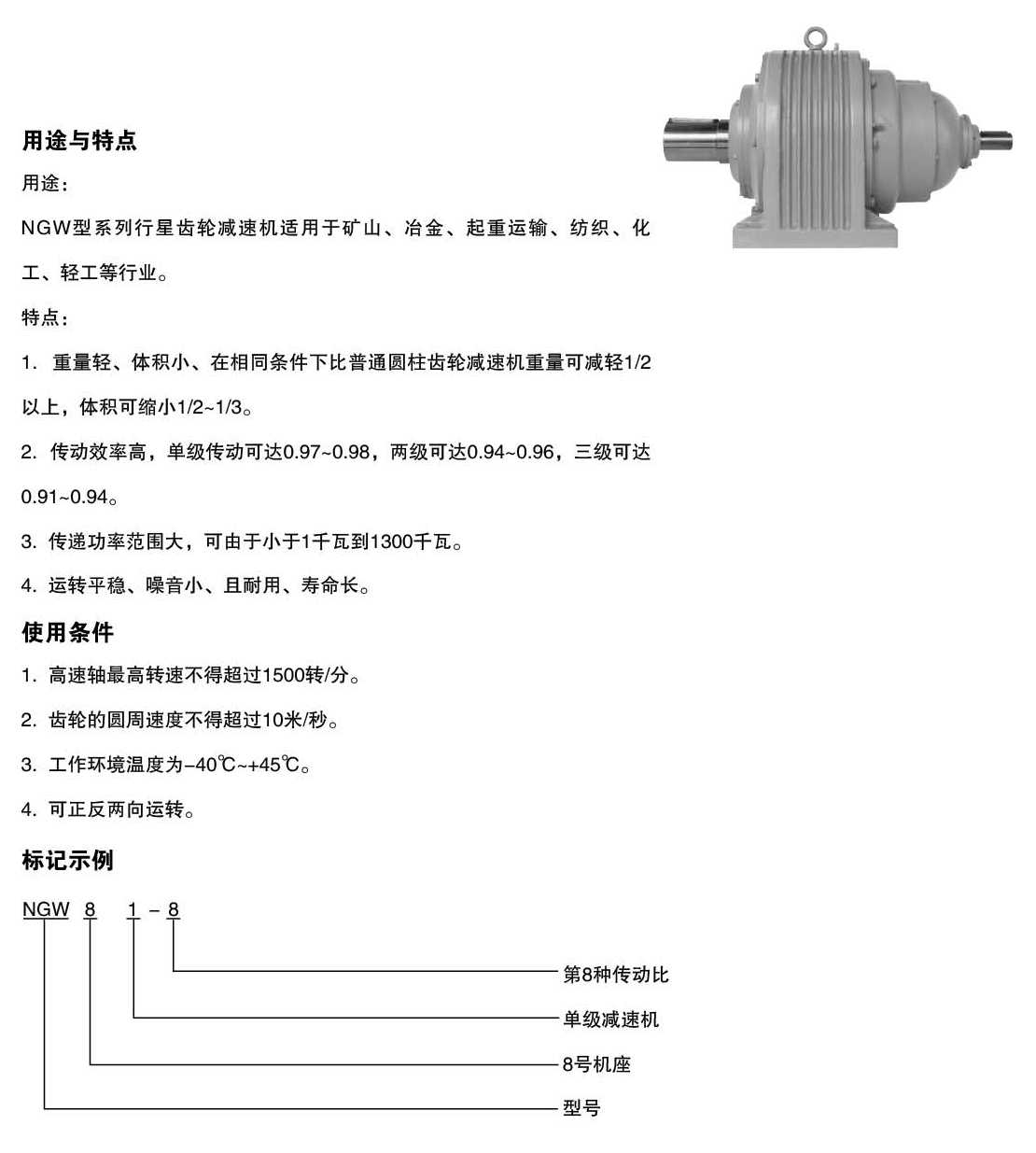 NGW型系列行星齒輪增速機(jī)適用于礦山、冶金、起重運(yùn)輸、紡織、化工、輕工等行業(yè)。